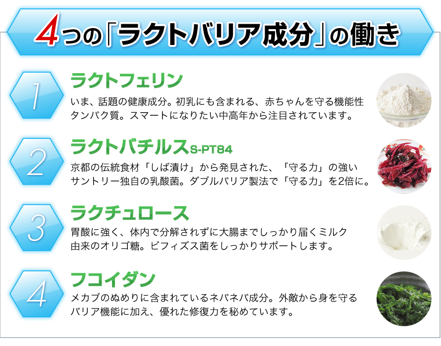 ラクチュロース、マルチトール、乳酸菌、フコイダン含有メカブ抽出物、HPMC、ビタミンB1、ラクトフェリン、酸化ケイ素、ビタミンB6、ビタミンB2、着色料(酸化チタン)、ステアリン酸Ca、タルク、グリセリン、増粘剤(アラビアガム)、光沢剤(原材料の一部に乳成分を含む)